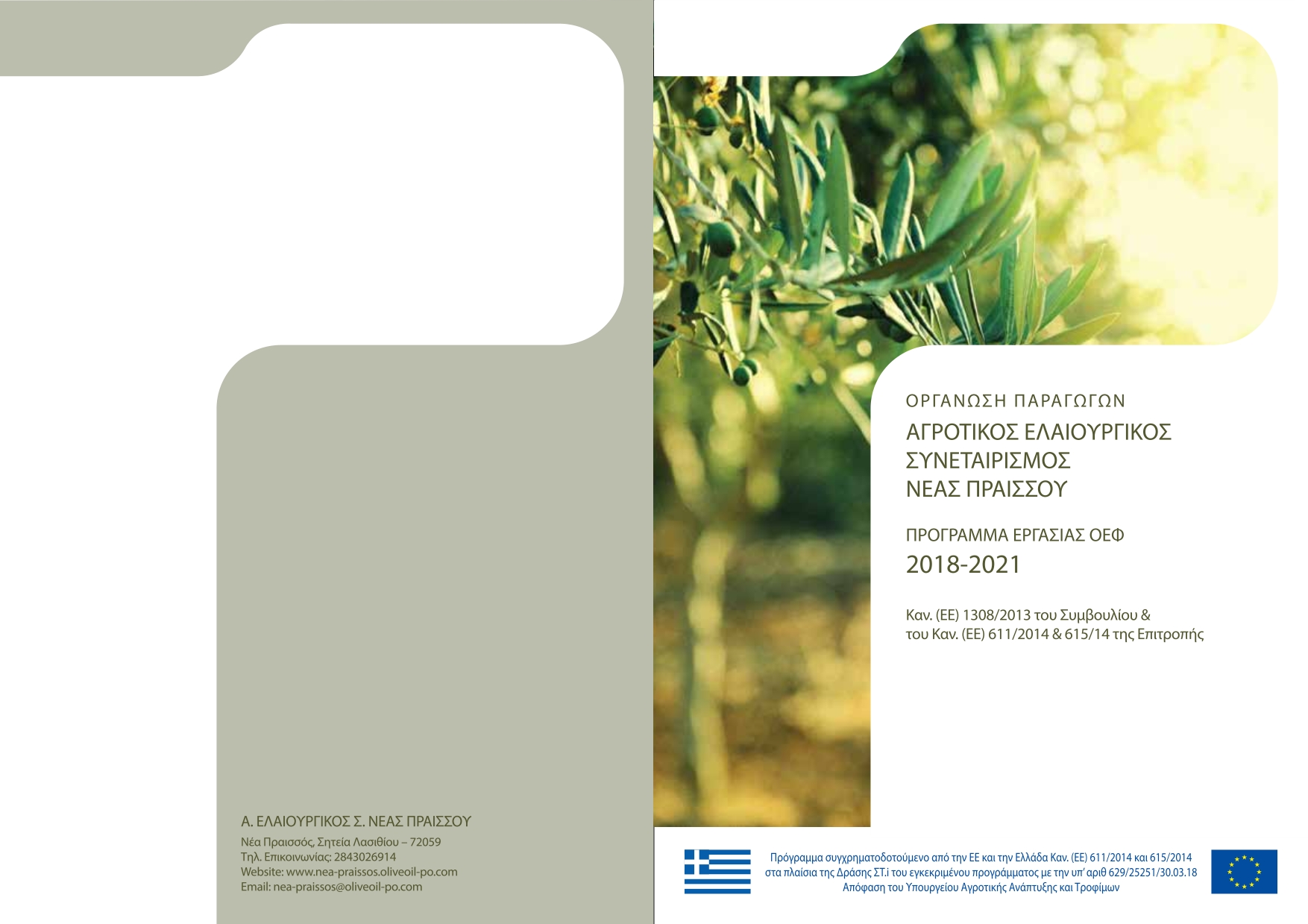 Οι εγκεκριμένες δραστηριότητες του προγράμματος της Ο.Ε.Φ. – Αγροτικός Ελαιουργικός Συνεταιρισμός Νέας Πραισσού εντάσσονται στους ακόλουθους πέντε (5) τομείς δράσης που καθορίζονται από το Άρθρο 3 παράγραφος 1 του Κανονισμού (ΕΕ) αριθ. 611/2014 και αποτελούν επιλέξιμες δραστηριότητες για Ενωσιακή και Εθνική χρηματοδότηση.
