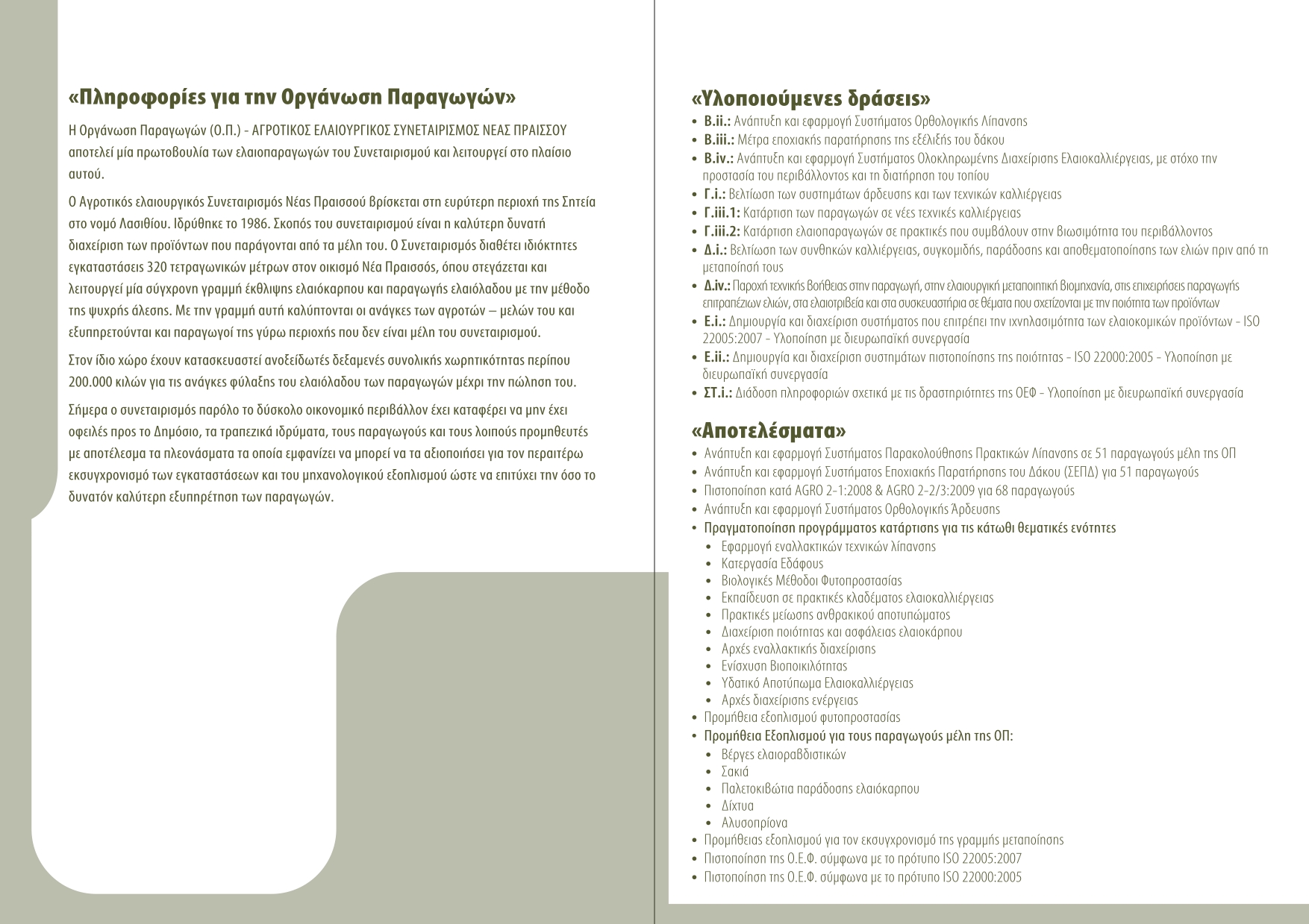 - Τομέας (Β): Βελτίωση των περιβαλλοντικών επιπτώσεων της ελαιοκαλλιέργειας,